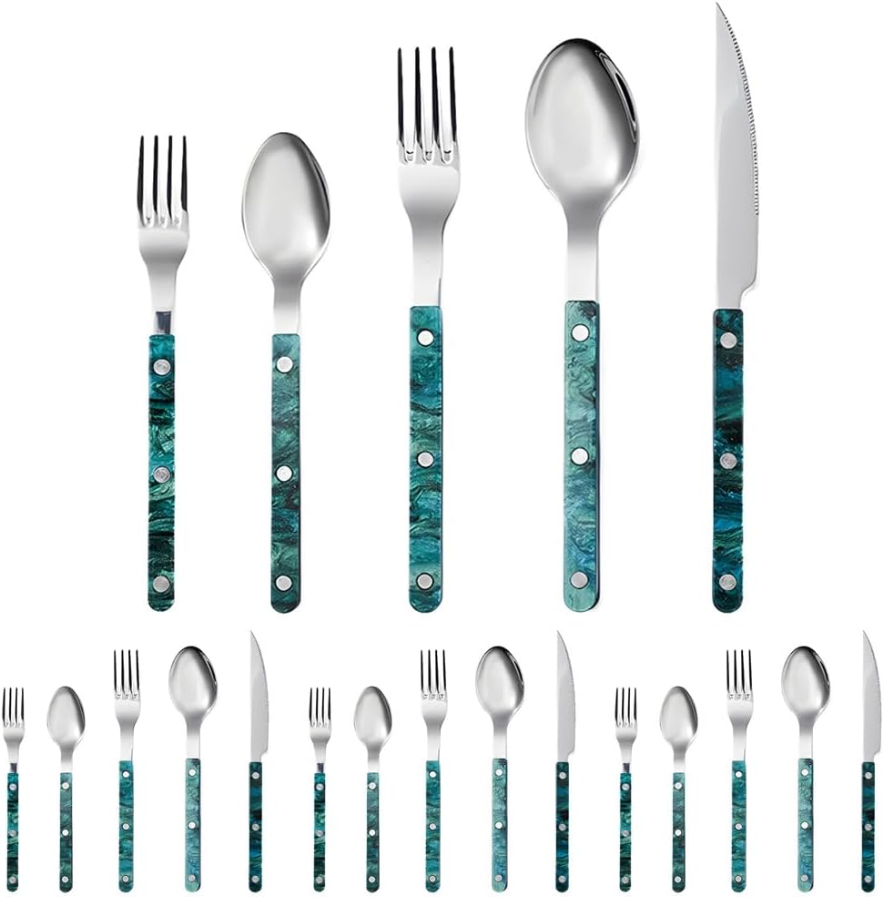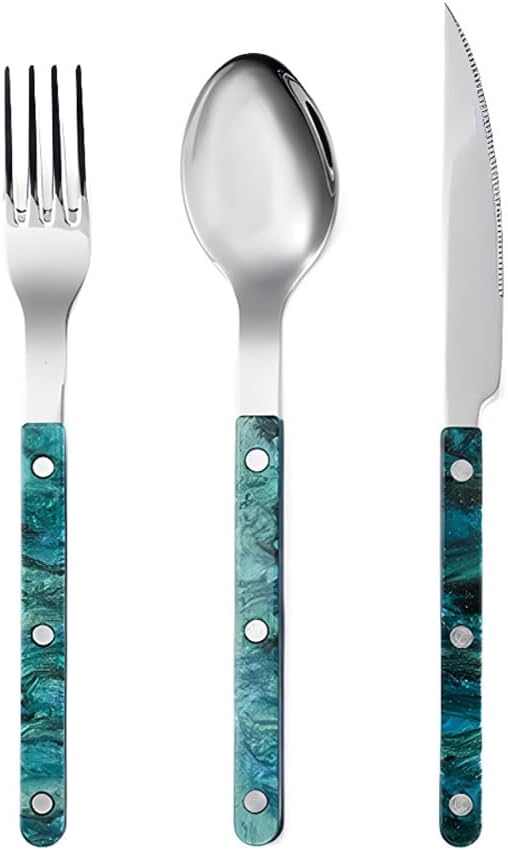 Packing quantity: 3 pieces = main table knife * 1, main table fork * 1, main table spoon * 15 pieces = main table knife * 1, main table fork * 1, main table spoon * 1, dessert spoon * 1, dessert fork * 16 pieces = main table knife * 1, main table fork * 1, main table spoon * 1, dessert spoon * 1, dessert fork * 1, butter knife * 1Cake shovel = 1 pieceRice spoon = 1 piece12 pieces = main table knife * 4, main table fork * 4, main table spoon * 420 pieces = main table knife *4, main fork*4, main spoon*4, dessert spoon*4, dessert fork*424 pieces = main knife*4, main fork*4, main spoon*4, dessert spoon*4, dessert fork*4, butter knife*4 Color: GrayPinkGreen Polishing process: cloth wheel polish (mirror polishing) Style type: light luxury retro Material: stainless steel Handle material: acrylic clamp handle Stainless steel material: 304 stainless steel Style: pastoral style