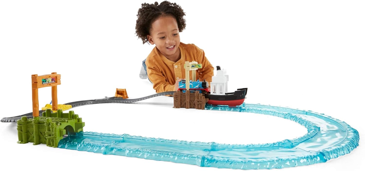 Product Description All aboard for the Thomas & Friends TrackMaster Boat & Sea Set! Children's imaginations will set sail as Thomas journeys across international waters in this unique, motorized toy train set. Always up for an adventure, Thomas goes from racing around the train tracks on land to sailing across the sea in a ship. That's right – motorized Thomas will power the rocking toy boat, propelling it around the "watery" path from dock to dock. He'll bravely navigate the strong ocean waves from Brazil to China, where he'll safely return to the rails. Children's storytelling skills will come to life as they imagine thrilling tales of Thomas' journey – from speeding across the winding tracks to conquering the high seas. Adventure awaits, so anchors away! Brand Story TrackMaster toys let children build a custom-made motorized railway with connectable track sets and their favorite Thomas & Friends characters. Kids can race with friends and experience thrilling moments as Thomas reaches greater speeds, taller heights and bigger adventures!